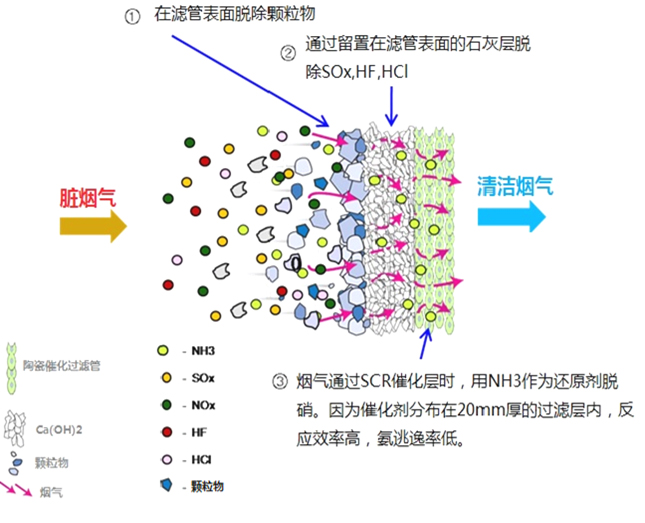 ●陶瓷催化過濾器內(nèi)濾管表面脫硫反應(yīng)床層的存在,使煙氣中酸性成分和脫硫劑充分接觸,進(jìn)一步延長反應(yīng)時間,提高脫硫效率,降低脫硫劑的消耗量,該反應(yīng)床層本身還作為過濾層進(jìn)一步增加顆粒物的過濾效率;